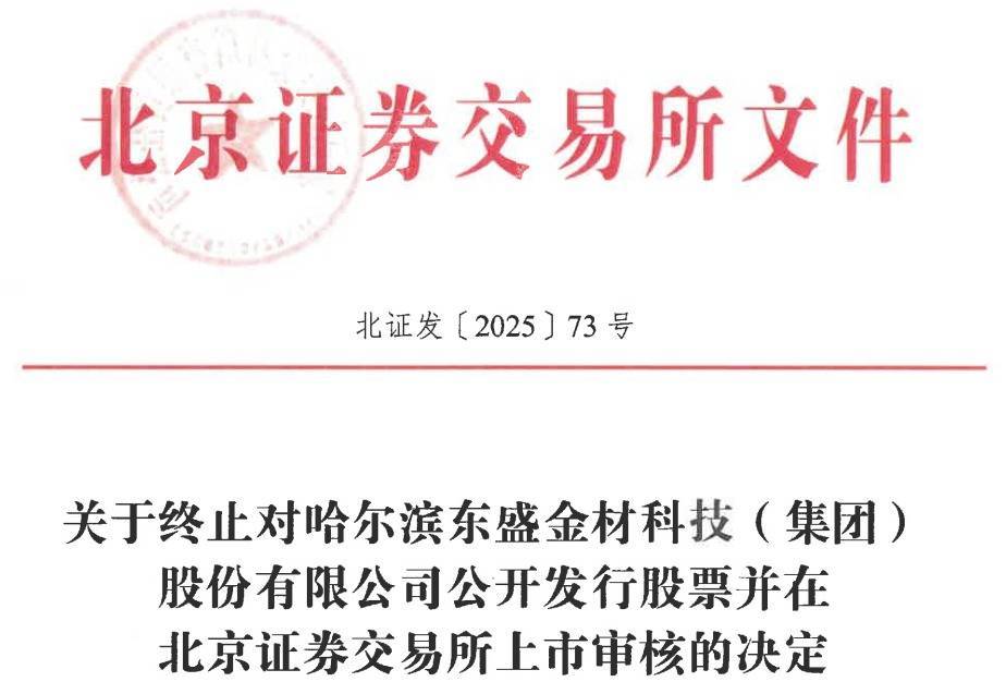 中国经济网北京12月14日讯 据北交所网站12月12日公告显示,北交所决定终止哈尔滨东盛金材科技(集团)股份有限公司(以下简称“东盛金材”)首次公开发行股票并在北京证券交易所上市审核。