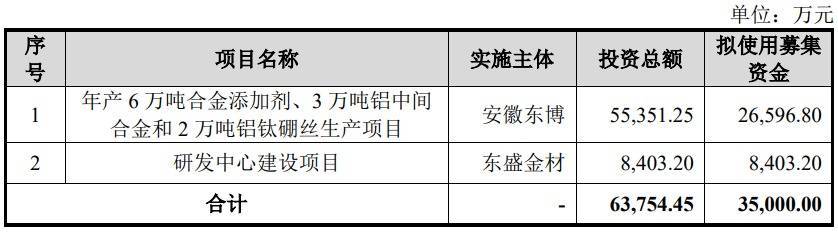东盛金材原拟募集资金35,000.00万元,用于“年产6万吨合金添加剂、3万吨铝中间合金和2万吨铝钛硼丝生产项目”和“研发中心建设项目”。